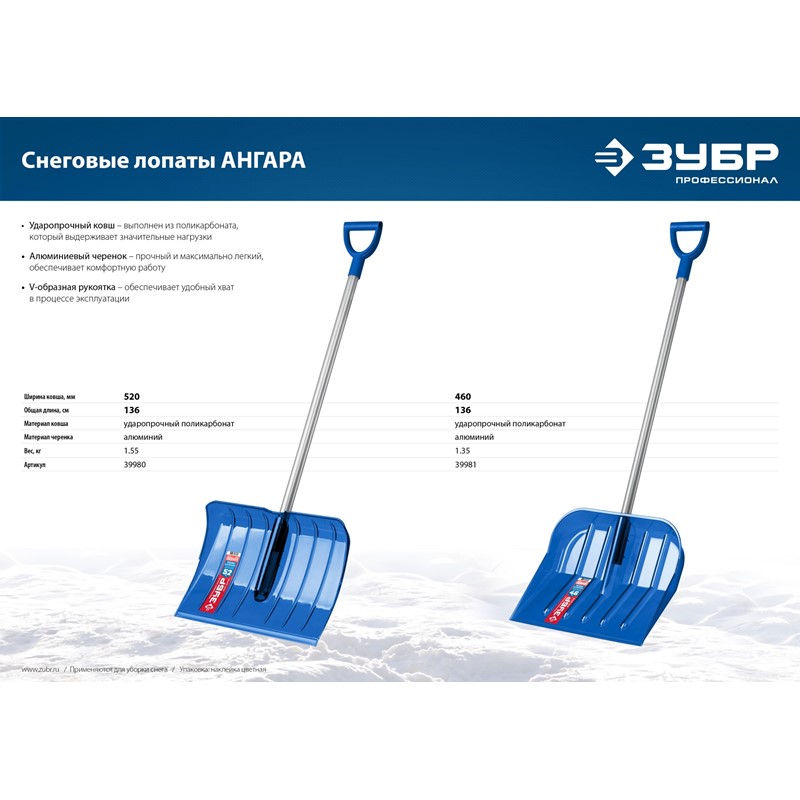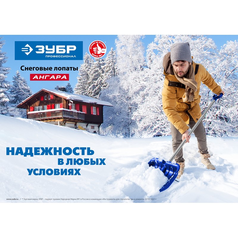 Ударопрочная снеговая лопата ЗУБР АНГАРА из морозостойкого поликарбоната, легкий черенок из алюминия, V-ручка, ковш 46см