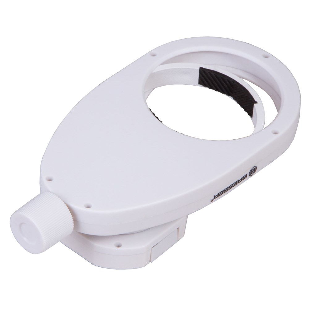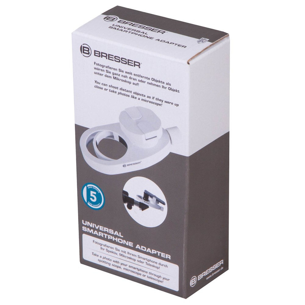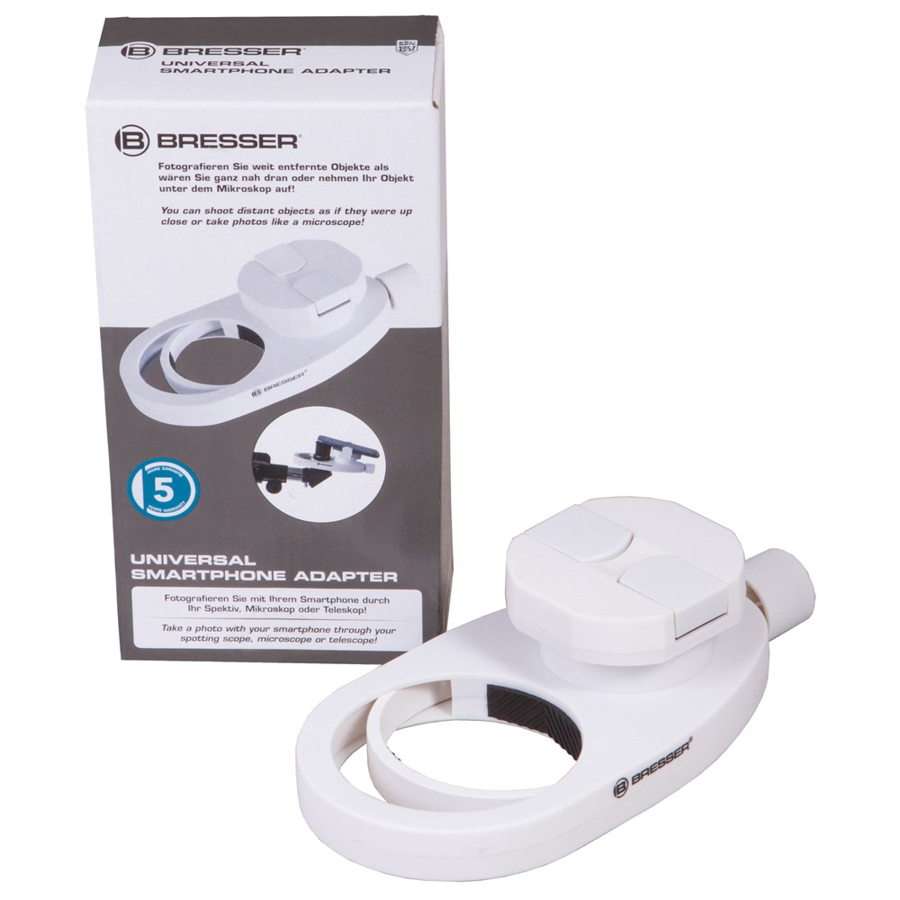 Этот адаптер Bresser разработан специально для крепления смартфона на разной оптической технике – зрительных трубах, микроскопах и телескопах. Он фиксируется на держателе окуляра и дает возможность расположить камеру мобильного устройства точно над окуляром. Использование адаптера позволяет заниматься фото- и видеосъемкой микромира, космоса и окружающего мира без приобретения дорогостоящей цифровой камеры. Адаптер для смартфона Bresser можно использовать с оптической техникой и смартфонами любых брендов. Есть лишь ограничения по размерам: диаметр окуляра не должен превышать 68 мм, ширина смартфона – 88 мм.