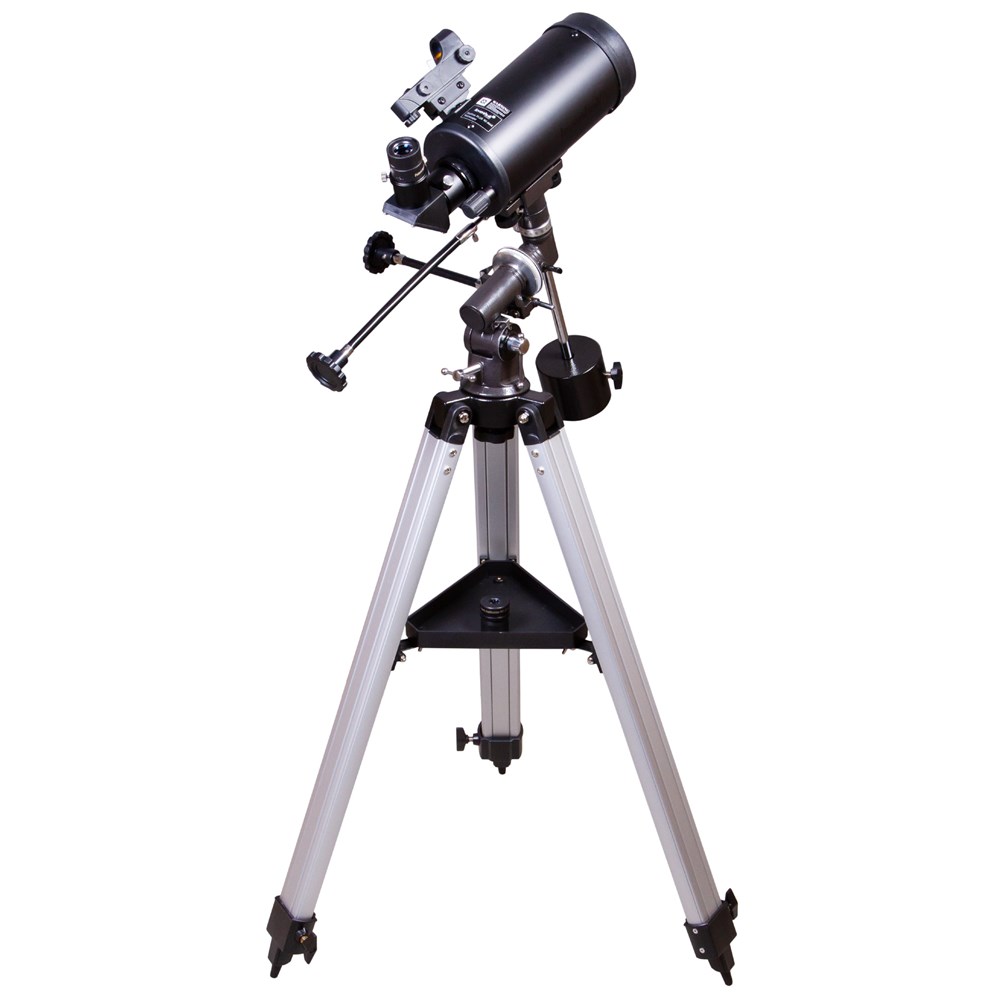 Телескоп Levenhuk Skyline PLUS 90 MAK – это зеркально-линзовый телескоп, который одинаково эффективен при изучении и ближнего, и дальнего космоса. А еще его можно использовать для наземных наблюдений, он легко заменяет собой мощную зрительную трубу. Но все-таки основное его предназначение – астрономические исследования. С помощью телескопа можно рассматривать лунные кратеры, кольца Сатурна, Большое Красное Пятно на Юпитере, погодные изменения на Марсе и Венере. Уран и Нептун различимы, но без деталей. Возможности оптики по отображению дальнего космоса тоже радуют – для наблюдений доступны все объекты каталога Мессье, ярчайшие объекты из каталога NGC, десятки планетарных и диффузных туманностей, двойные звезды и многое другое. Телескоп собран по зеркально-линзовой схеме. А это значит, что в нем сочетаются компактная конструкция и отличные оптические возможности. Этот телескоп можно поставить на лоджию, с ним удобно путешествовать. Из оптических аксессуаров в комплект поставки включены два разнофокусных окуляра и диагональное зеркало. Последнее используется для наземных наблюдений. Для наведения на астрономические объекты применяется искатель с красной точкой. Экваториальная монтировка управляется при помощи ручек тонких движений. Следить за движением небесных тел удобно и легко. Монтировка крепится к алюминиевой треноге. На нее устанавливается лоток для аксессуаров. Высоту ножек треноги можно регулировать.