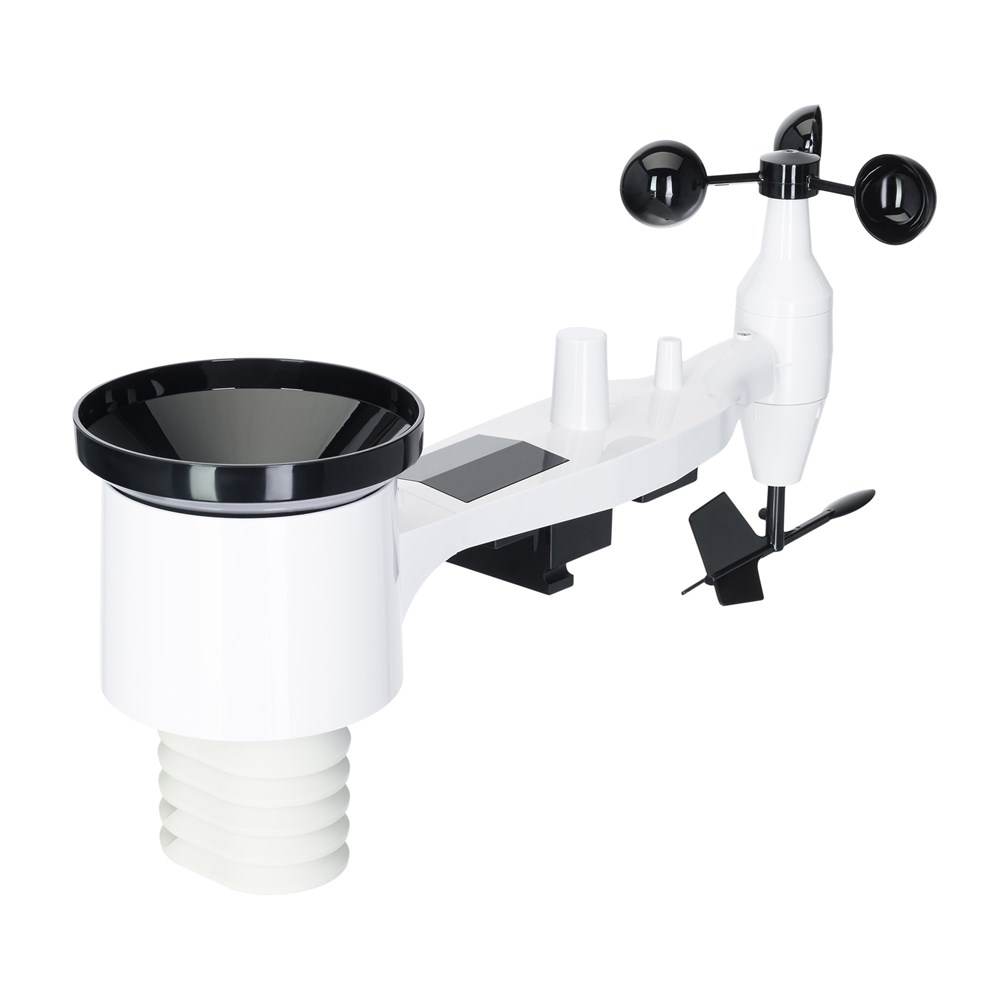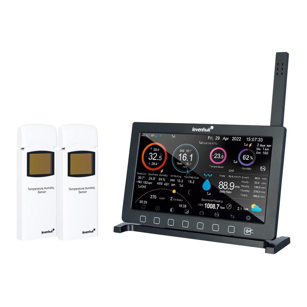 Метеостанция Levenhuk Wezzer PRO LP500 – это инструмент для профессионального наблюдения за погодой и микроклиматом в помещении, который можно приобрети и для бытового применения: станция отличается простым управлением и удобным дизайном. Основной модуль метеостанции устанавливается в помещении и работает от сети, а выносной радиодатчик «9 в 1», работающий от батареек и дополнительной встроенной солнечной панели, располагается на улице. Солнечная панель применяется только для непосредственного питания, она не может заряжать аккумуляторы. Прибор предоставляет актуальные и точные результаты измерений температуры и влажности воздуха (в помещении и снаружи), уровня осадков и ультрафиолетового излучения, атмосферного давления, теплового индекса и точки росы. Помимо текущих измерений станция записывает историю наблюдений, запоминает минимумы и максимумы, формирует графики изменений показателей и прогнозирует погоду. Также станция имеет функцию «Feels like», которая показывает, как температура ощущается в реальности, и оповещает о достижении высоких или низких показателей относительно референсных значений, установленных пользователем. Для удобства пользователя на экран основного модуля выводятся часы и календарь с отслеживанием фаз Луны, есть возможность установить будильник. В станцию можно установить карту памяти до 32 ГБ, а также c помощью Wi-Fi подключать ее к погодным сервисам для обмена информацией: для этого необходимо расположить станцию на расстоянии не более чем в 50 метрах от роутера, а при помощи мобильного приложения загруженные данные можно будет увидеть на экране смартфона.
