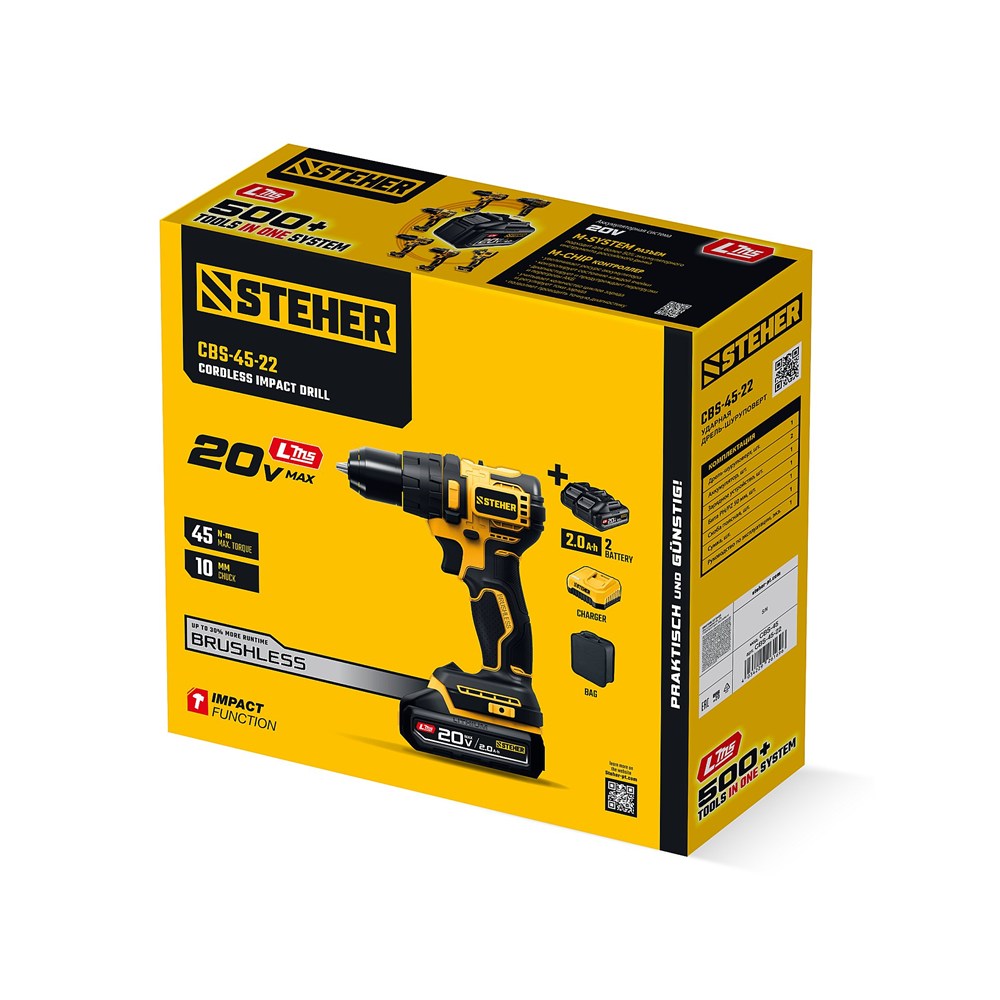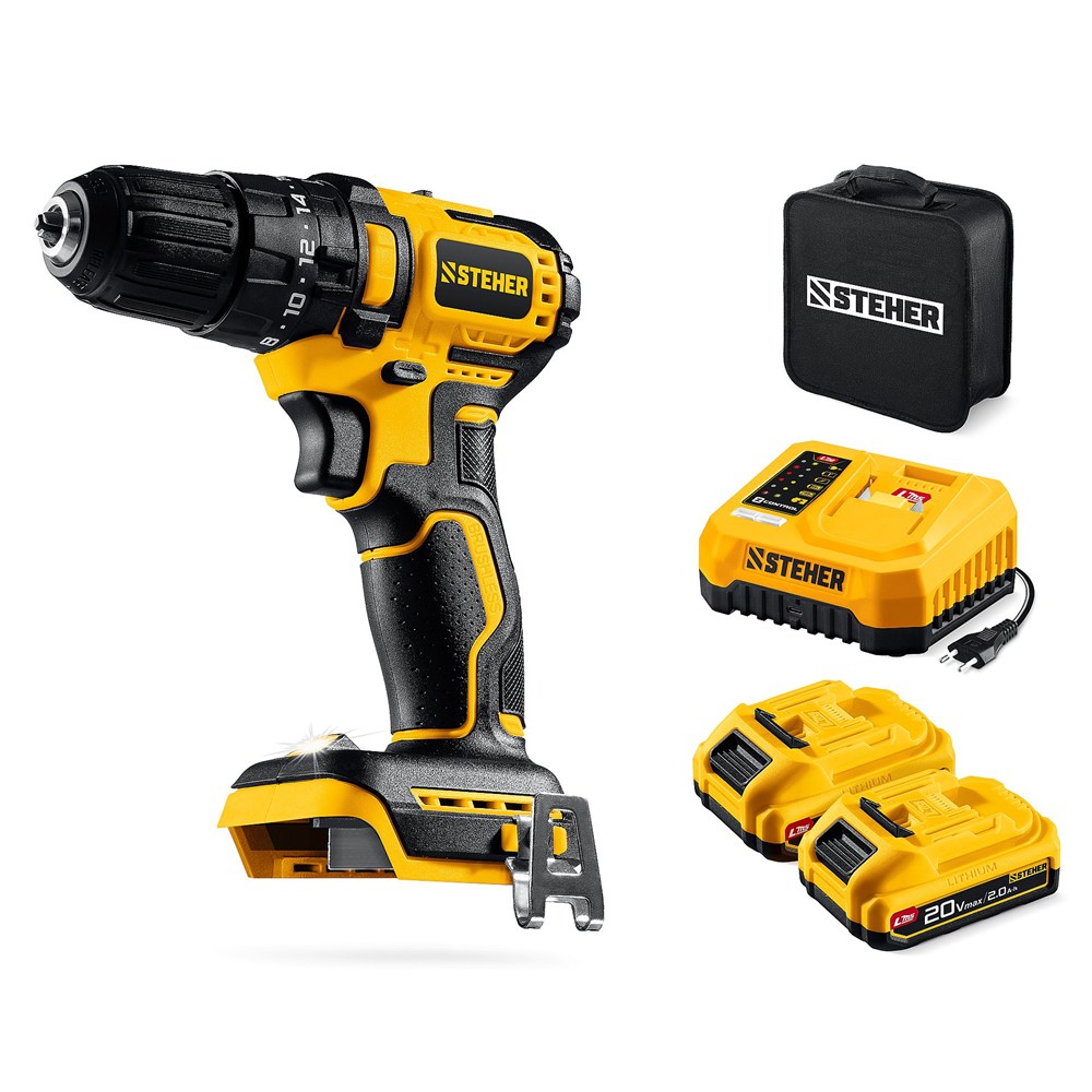 STEHER 20 В, 45 Н·м, 2 АКБ LMS (2 А·ч), бесщеточная ударная дрель-шуруповерт, сумка (CBS-45-22)