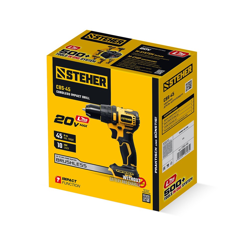 STEHER 20 В, 45 Н·м, без АКБ (LMS), бесщеточная ударная дрель-шуруповерт (CBS-45)