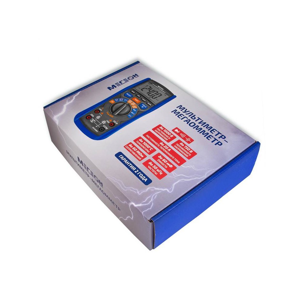 МЕГЕОН 12060 – это мультиметр-мегаоометр, котрый объединяет в одном корпусе цифровой измеритель сопротивления изоляции и цифровой мультиметр. Это обеспечивает максимальную универсальность применения как для диагностики, так и для технического обслуживания. Мультиметр измеряет переменное (TueRMS) и постоянное напряжение, переменный и постоянный ток, сопротивление, ёмкость, частоту, температуру и скважность (Duty Cycle), а также имеет функции проверки целостности цепи (прозвонка), диодного теста, бесконтактного датчика напряжения (NCV), определения максимального и минимального значения, функцию относительных измерений, подсветки дисплея, свето-звукового оповещения, удержания измеренных значений (Hold) и автоматического выключения для экономии заряда батарей. Функция мегаомметра обеспечивает измерение электросопротивления изоляционного покрытия для определения его целостности.