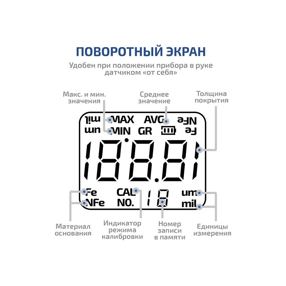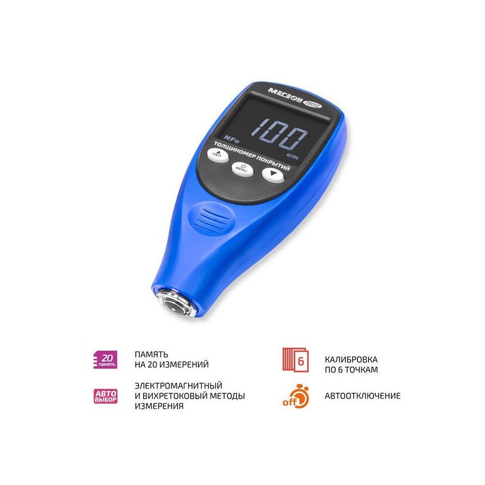 Толщиномер покрытий МЕГЕОН 19012 предназначен для измерения толщины лакокрасочных, полимерных, цинковых, медных и других покрытий на основаниях из чёрных и цветных металлов. В приборе комплексно реализовано два метода измерения – электромагнитный и вихретоковый. Выбор режима выполняется автоматически в зависимости от типа металла под покрытием – ферромагнитного или неферромагнитного. Первым включается электромагнитный режим, а при отсутствии в пределах видимости ферромагнитного материала прибор переключается на вихретоковый режим для обнаружения неферромагнитного основания. В обоих случаях толщиномер измеряет расстояние от датчика до металлического основания. С его помощью можно измерить: На железе – толщину слоя диэлектрика, токопроводящего немагнитного материала или их суммарную величину при комбинированном нанесении. Например, слой цинка на неокрашенном кровельном железе или общую толщину цинка с дополнительно нанесённым полимером. На цветных металлах – толщину покрытия из диэлектрических материалов. К примеру, слой краски на алюминиевом листе. Список можно дополнить полиэтиленовой плёнкой, фольгой, скотчем, бумагой и другими тонкими немагнитными материалами при наложении их на подходящую подложку. Результаты отображаются на контрастном жидкокристаллическом дисплее, сохраняются в память для последующего анализа и обрабатываются функциями вычисления максимального, минимального и среднего значений. Для повышения точности в программном обеспечении предусмотрена пользовательская калибровка по 6 точкам или по своему образцу, а в комплекте поставляется калибровочный набор. Толщиномер МЕГЕОН 19012 может успешно применяться для контроля качества окраски металлоконструкций на производстве и в строительстве, для поиска следов ремонта кузовных деталей при оценке автомобилей и во многих других сферах.
