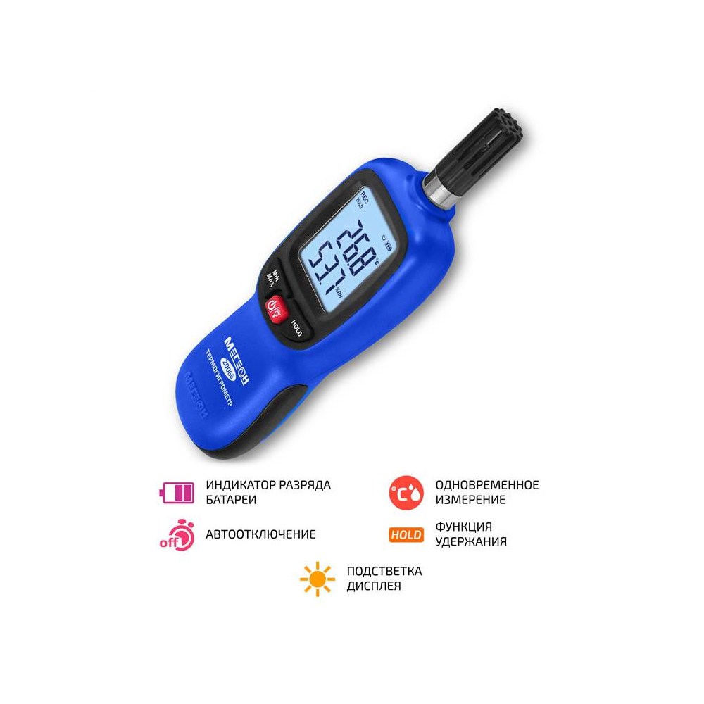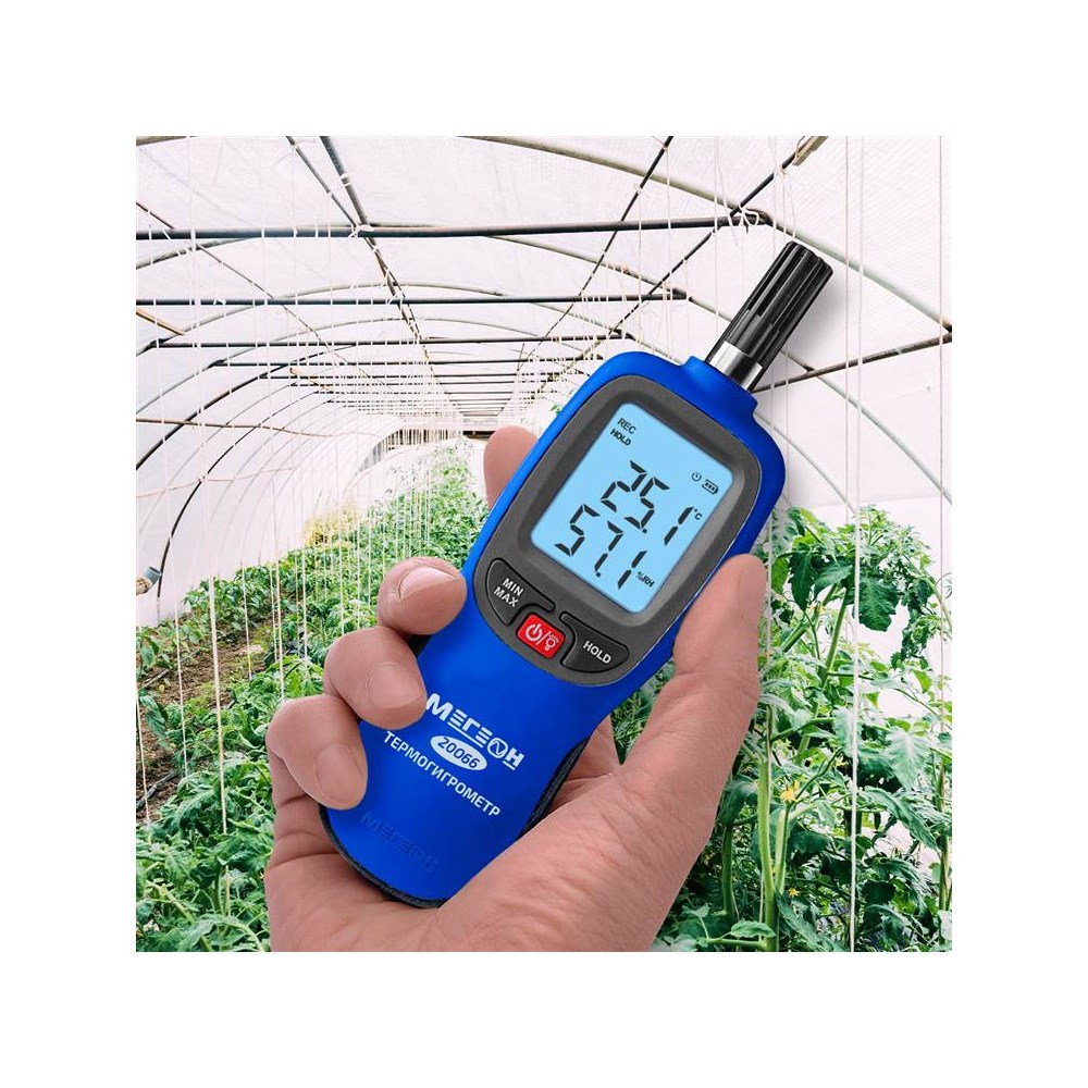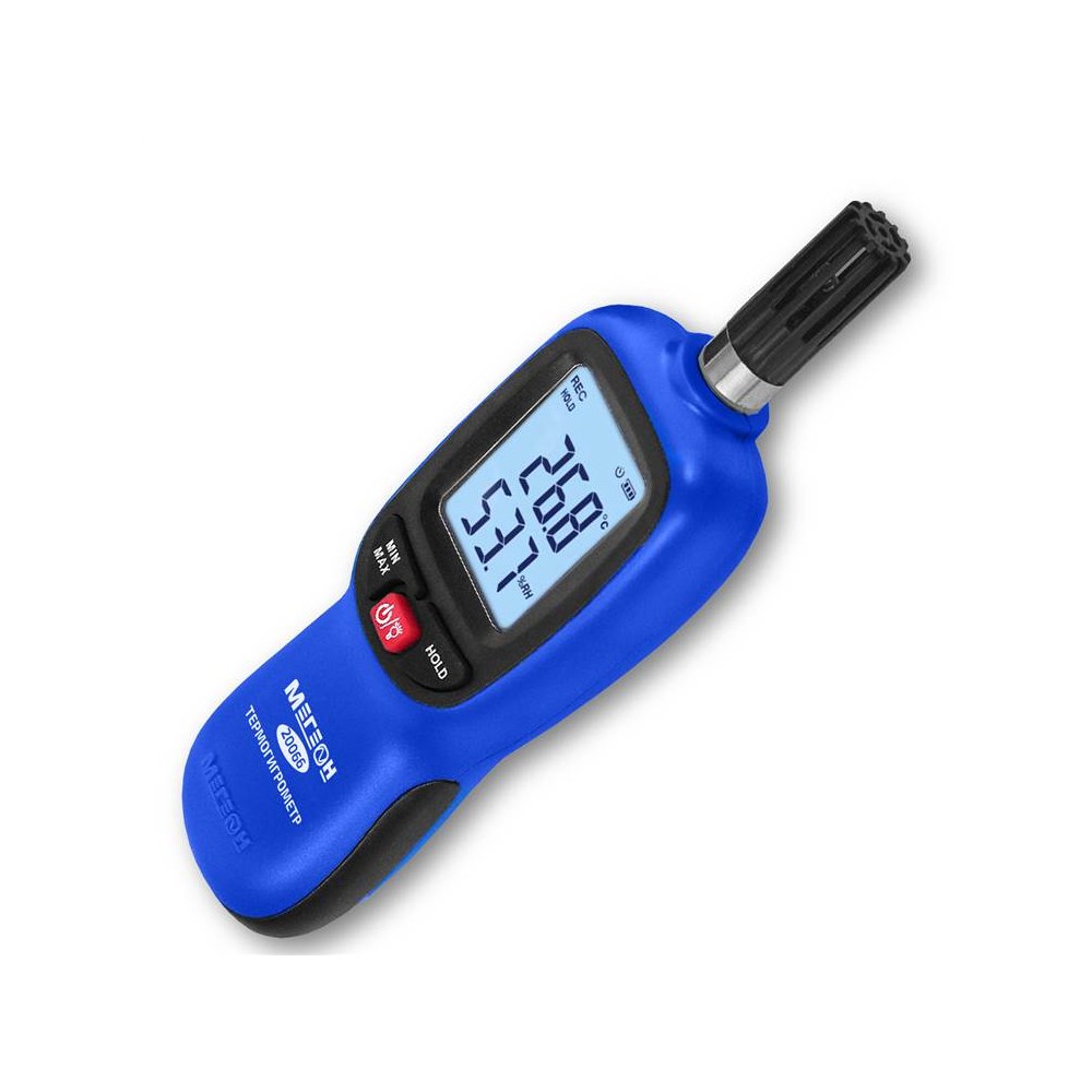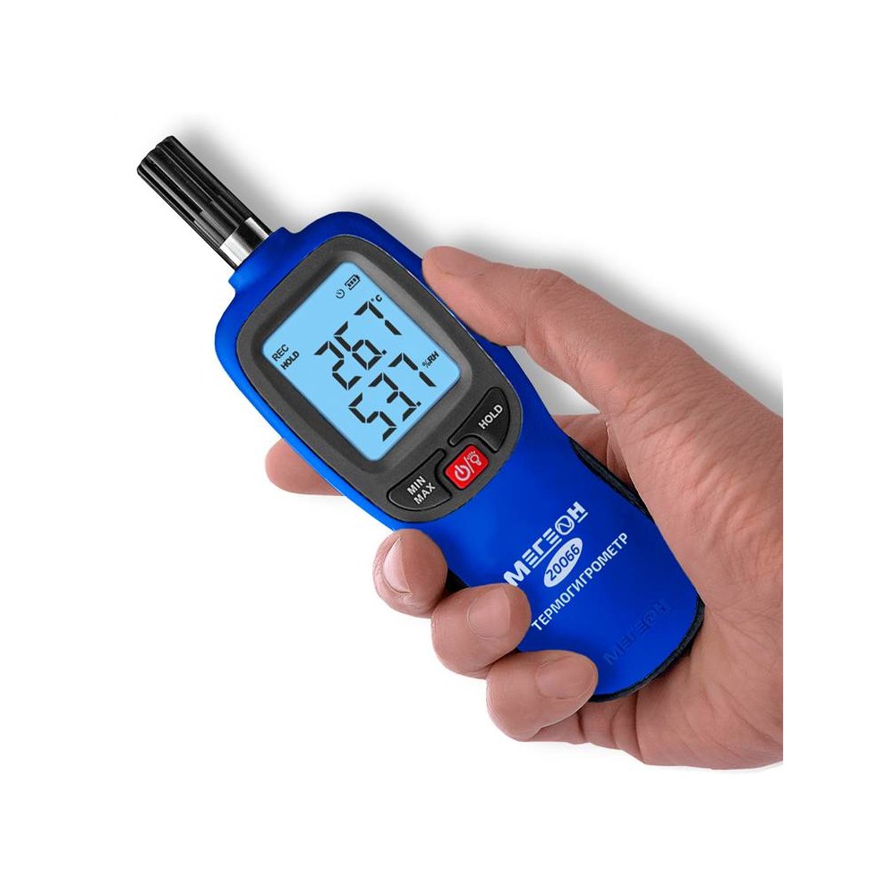 МЕГЕОН 20066 – новинка в модельном ряду цифровых высокочувствительных термогигрометров. Представленный прибор внесён в ГРСИ по номером 89786-23 и предназначен для быстрого определения параметров температуры и влажности с высокой точностью в помещениях и на открытом пространстве. Помимо этого с его помощью можно зафиксировать максимальные и минимальные значения измеренных данных. Преимуществом также является функция записи результатов в память ёмкостью 999 ячеек. Измеритель получил современный дизайн и компактные размеры. Модель имеет эргономичную форму корпуса, удобное расположение органов управления на передней панели и большой ЖК- дисплей с яркой светодиодной подсветкой. На задней стенке предусмотрено монтажное отверстие для установки на штатив, благодаря чему достигается максимальное удобство при эксплуатации.