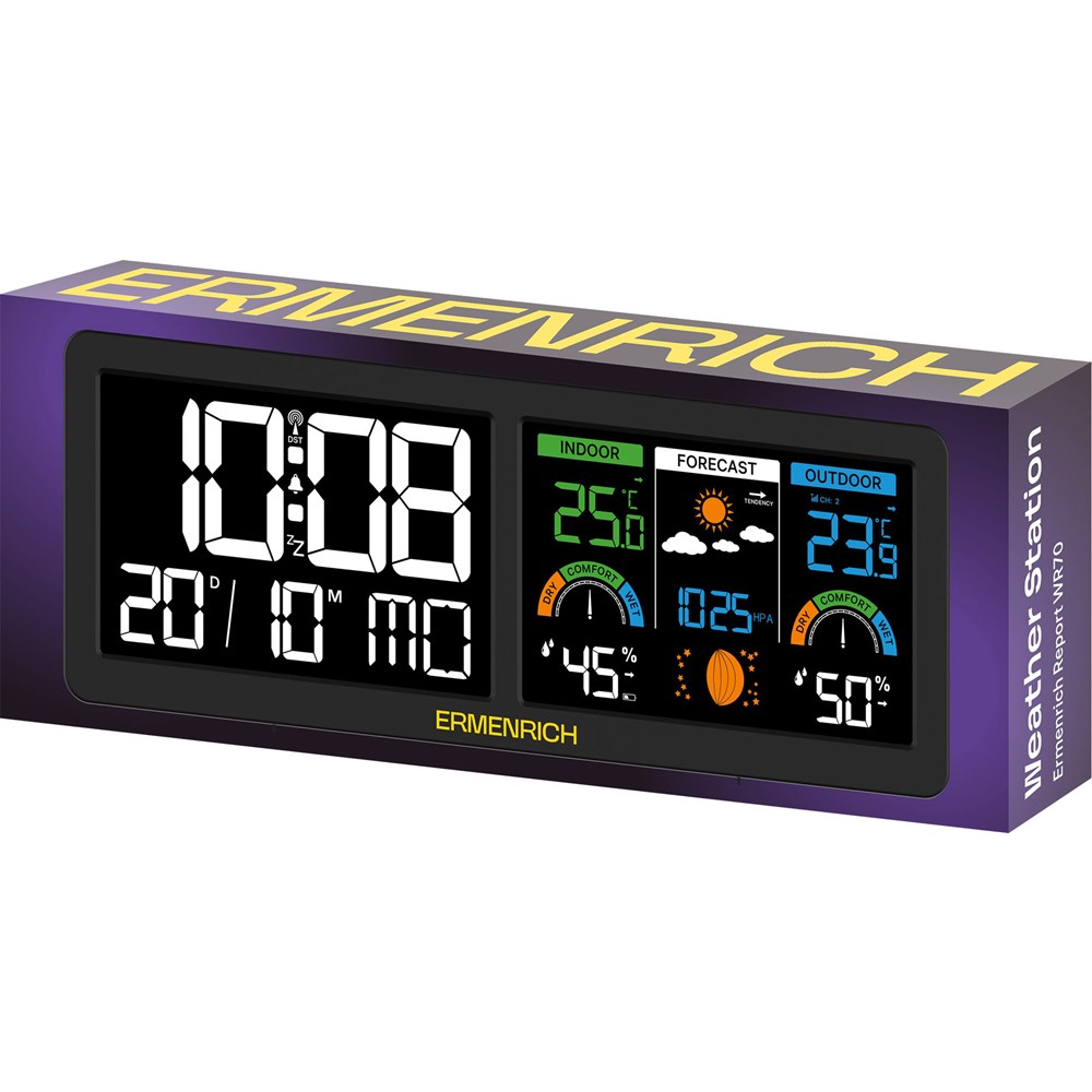 Домашняя метеостанция Ermenrich Report WR70 с двумя яркими экранами – это современное устройство, которое пригодится в любом городском жилище, загородном доме и даже офисе. Его можно поставить на обеденный стол, прикроватную тумбу или повесить на стену, чтобы всегда иметь доступ к актуальной информации о состоянии погоды за окном и микроклимате дома. Два цветных экрана с подсветкой легко читаются, крупный шрифт можно разобрать даже издалека, а пиктограммы с фазой Луны и прогнозом погоды будут понятны любому пользователю с первого взгляда. Тонкий черный корпус без излишеств впишется как в скромный, так и в богатый интерьер, и будет выглядеть органично и аккуратно.