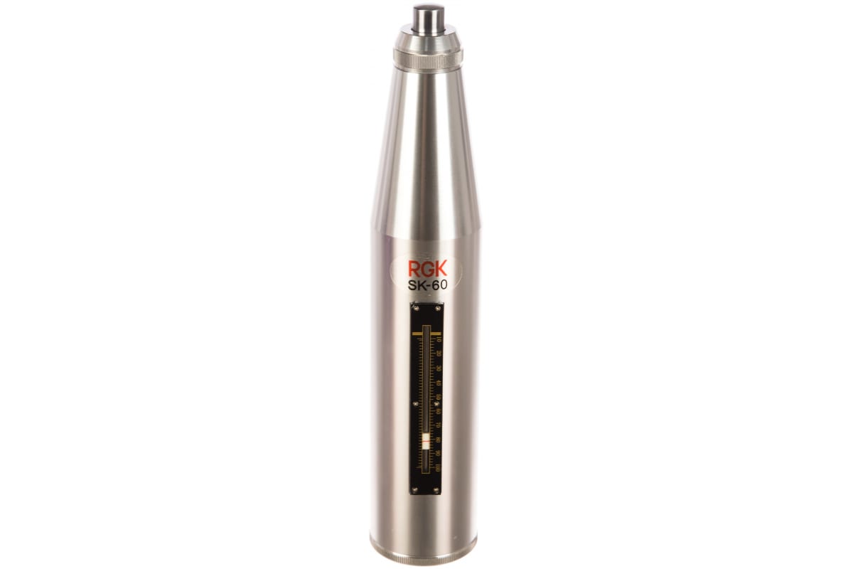 Принцип работы RGK SK 60 основан на измерении высоты отскока бойка в у.е. шкалы прибора о контролируемую поверхность объекта, что является косвенной характеристикой прочности на сжатие.