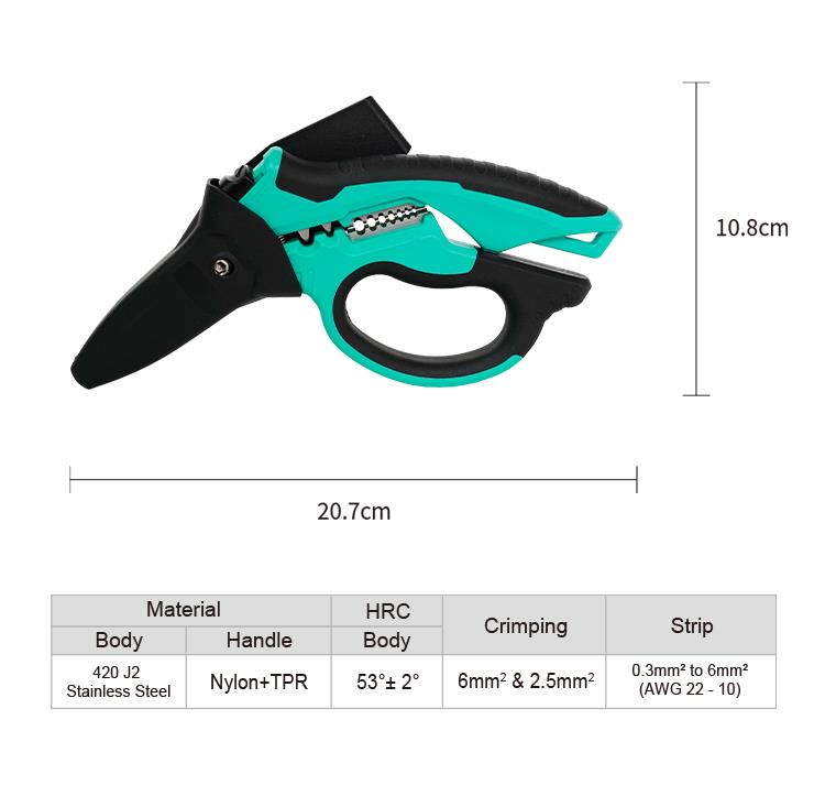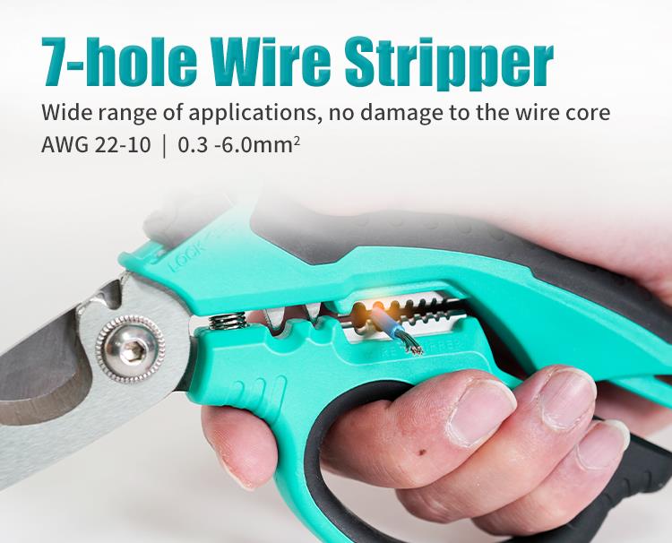 Функции инструмента для зачистки проводов между ручками: сечение от 0,3 мм² до 6 мм² (AWG 22-10).