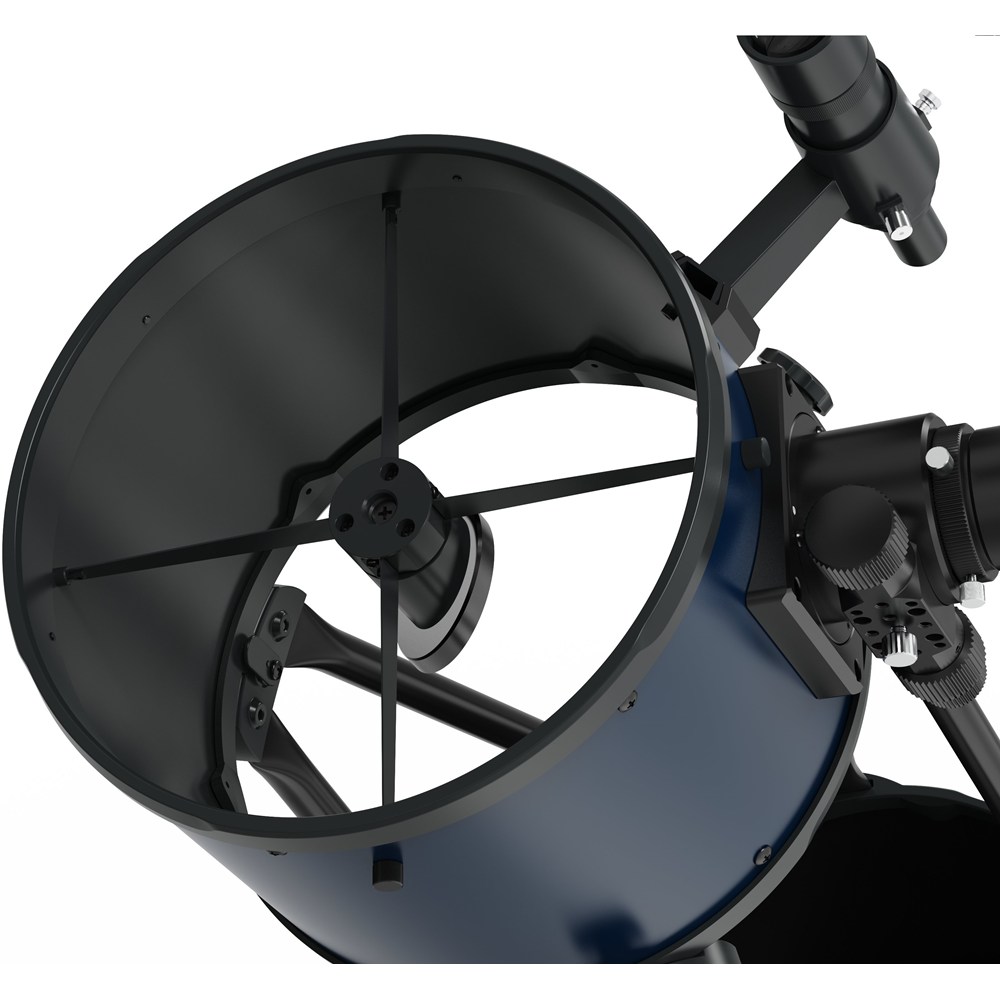 Стабильной платформой для тяжелой оптической трубы (вес 32,1 кг) служит прочная монтировка Добсона с ручным управлением, изготовленная из обработанного дерева и окрашенная в черный цвет. Практичность телескопа подчеркивает открытая каркасная ОТА (без возможности выдвигания) – она значительно упрощает транспортировку за город и хранение в ограниченных домашних условиях.