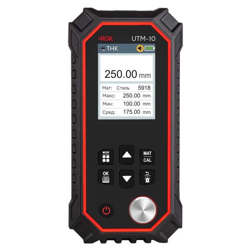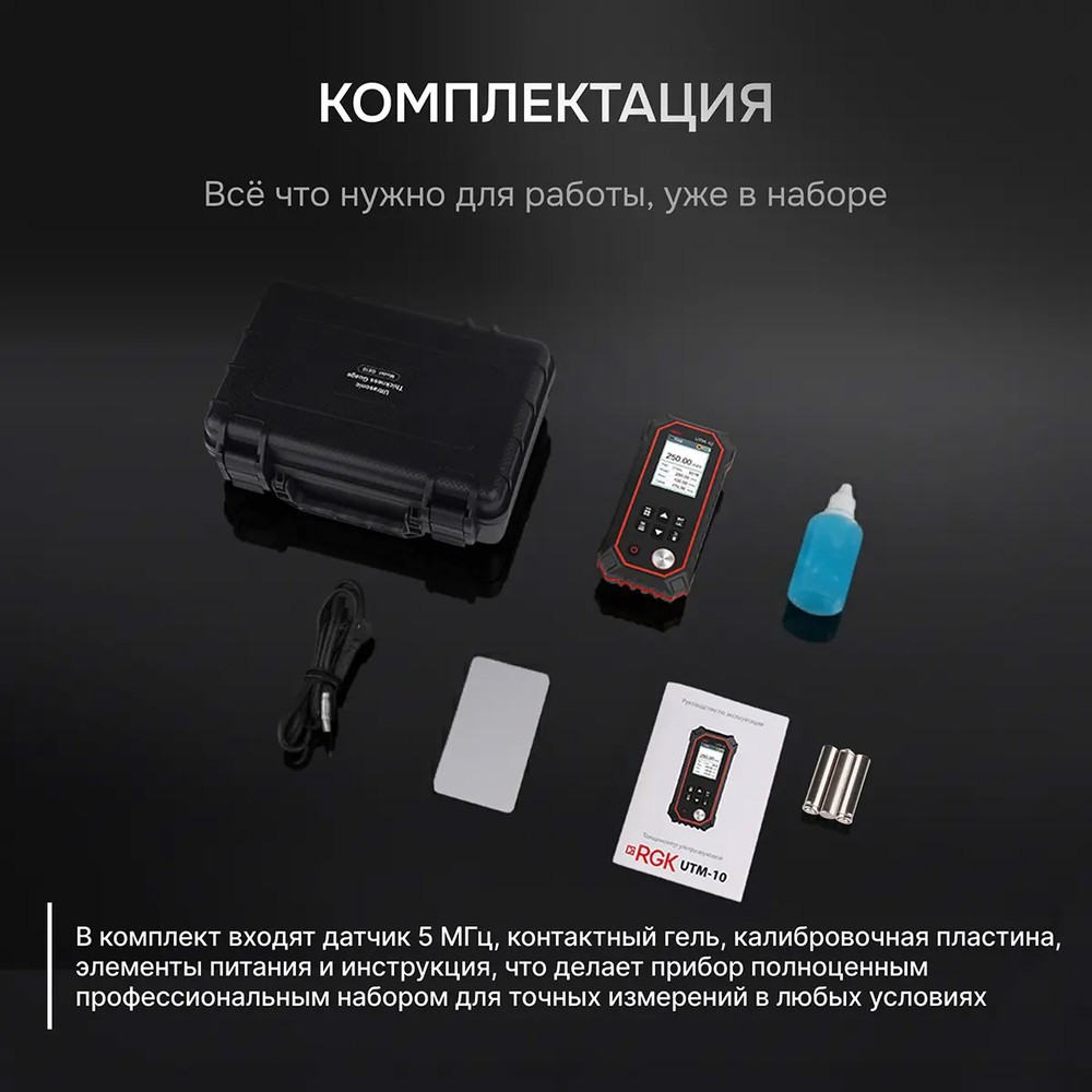 Предусмотрена возможность замены комплектного датчика на опциональные дополнительные зонды с другим частотным диапазоном, а также на сенсор в жаропрочном исполнении, предназначенный для проверки геометрии отливок, поковок и других изделий с высокой степенью нагрева. Для повышения точности при контроле геометрических параметров толщиномер RGK UTM-10 реализует функцию предварительного определения скорости распространения УЗ колебаний в конкретном материале. Данные можно сохранять для 3 пользовательских вариантов в настроечной таблице и использовать в ходе дальнейших измерений толщины. Инструмент запитывается от 3 батарей популярного типоразмера AA, что обеспечивает возможность выполнения измерений в любом месте.