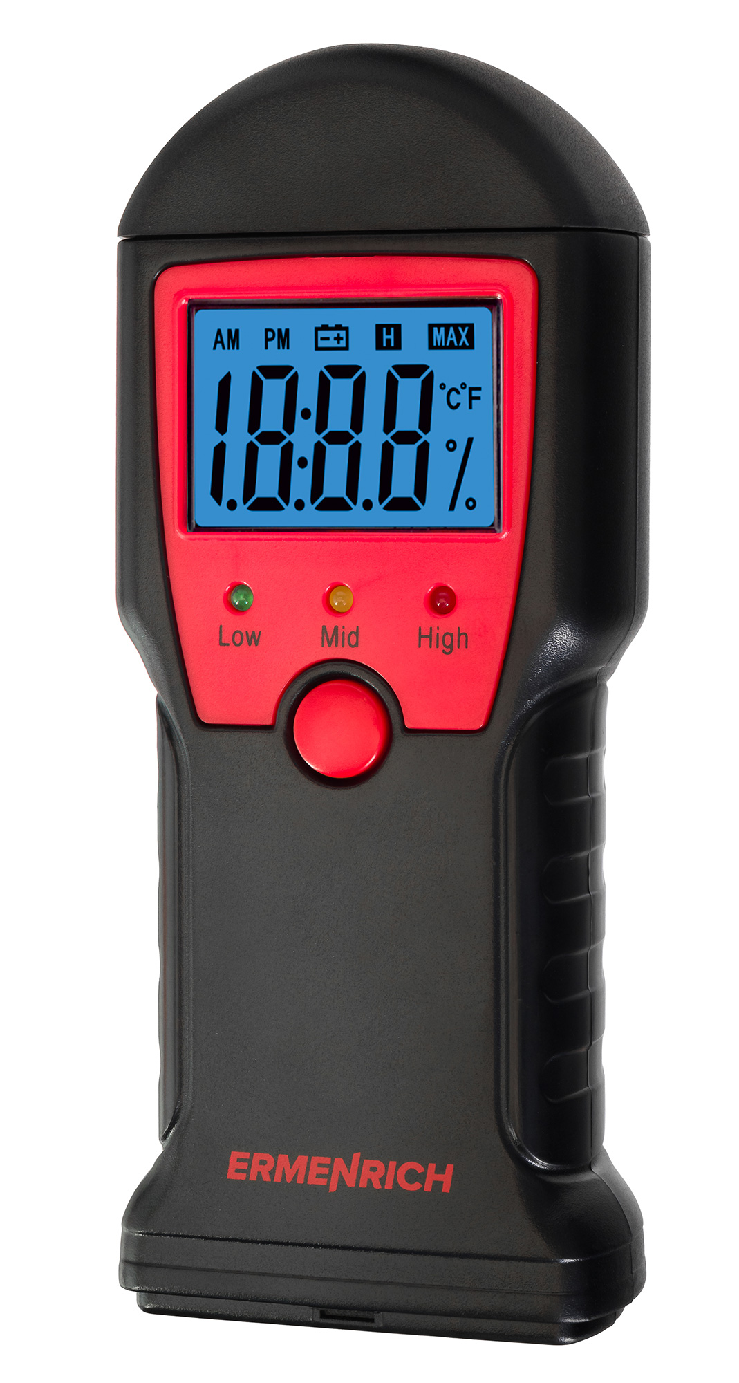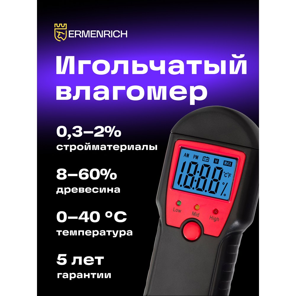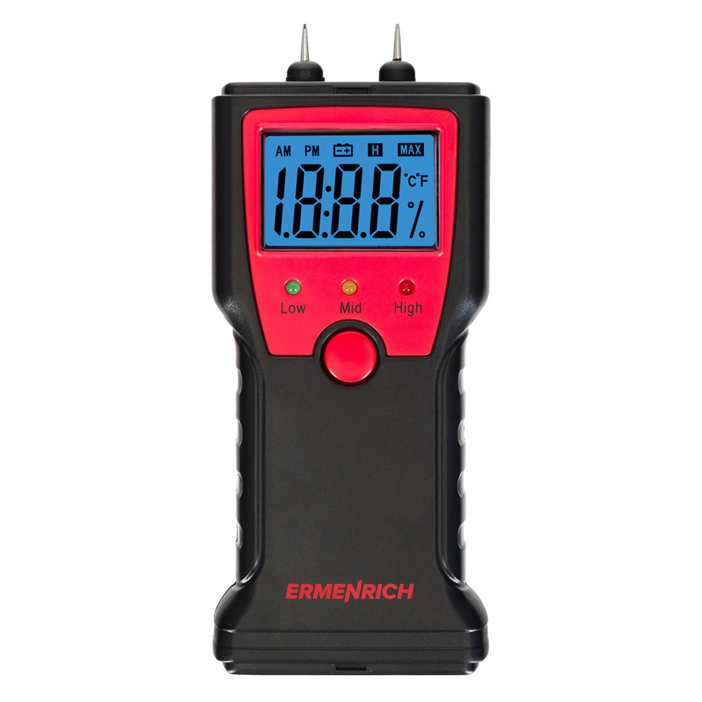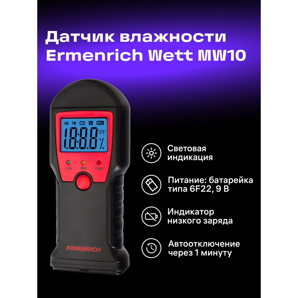 Датчик влажности (влагомер) Ermenrich Wett MW10 – портативный измерительный инструмент, который определяет уровень влажности разных материалов: в первую очередь сделанных из древесины, но также и предназначенных для строительных работ (растворов, смесей и проч.). Он работает по контактной технологии, т. е. имеет пару игольчатых сенсоров, которые и проводят замеры. Также прибор может определять температуру.