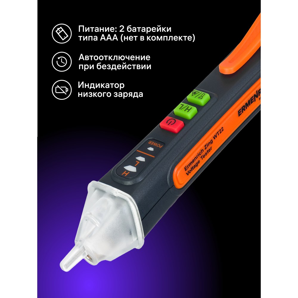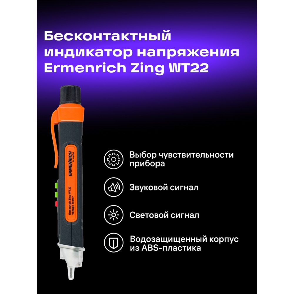 Бесконтактный индикатор напряжения Ermenrich Zing WT22 позволит обнаружить напряжение в кабеле электропитания и розетках, проверить их работоспособность, обнаружить обрывы. Световой и звуковой сигналы включаются при наличии напряжения и отключаются, когда оно пропадает. Прибор оснащен фонариком в условиях нехватки света.